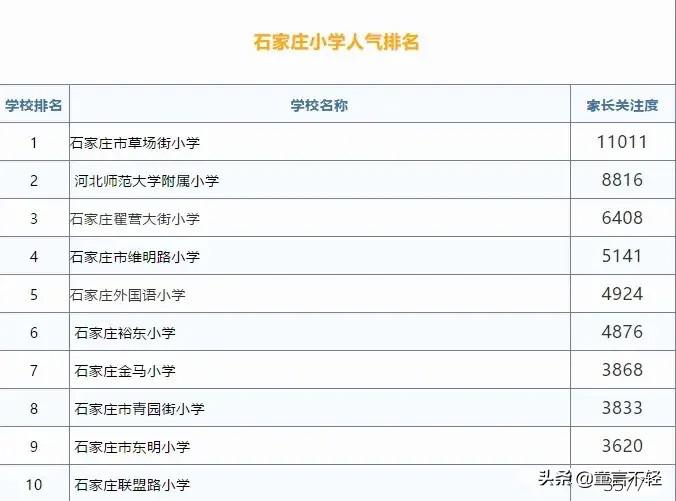看到一个教育机构对石家庄小学的排名以及家长关注度的排名,看了一眼,大部门排进去的学校都是热门学校。当然这里也是有漏项的,比如东风西路小学、裕华路小学、合作路小学、友谊大街小学等等都没有入围,有点不准确。所以,仅供家长参考。