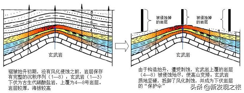 图4 岩层抬升剥蚀原理:成山过程中上覆松软岩层易于被剥蚀
