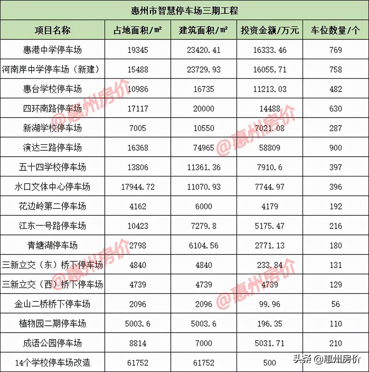 从备案明细可知,惠州市智慧停车场三期工程共计新增30座停车场,分别是惠港中学停车场、河南岸中学停车场(新建)、惠台学校停车场、四环南路停车场、新湖学校停车场、演达三路停车场、五十四学校停车场、水口文体中心停车场、花边岭第二停车场、江东一号路停车场、青塘湖停车场、三新立交(东)桥下停车场、三新立交(西)桥下停车场、金山二桥桥下停车场、植物园二期停车场、成语公园停车场,以及14个学校停车场改造。