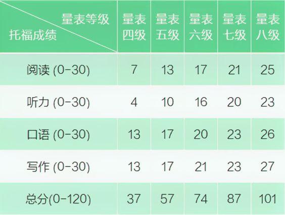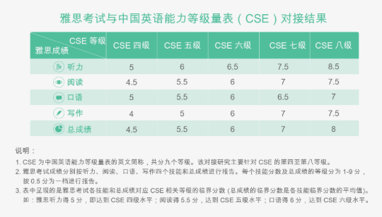 中国英语能力等级量表四级对应雅思总成绩4.5分,五级对应5.5分,六级对应6分,七级对应7分,八级对应8分。