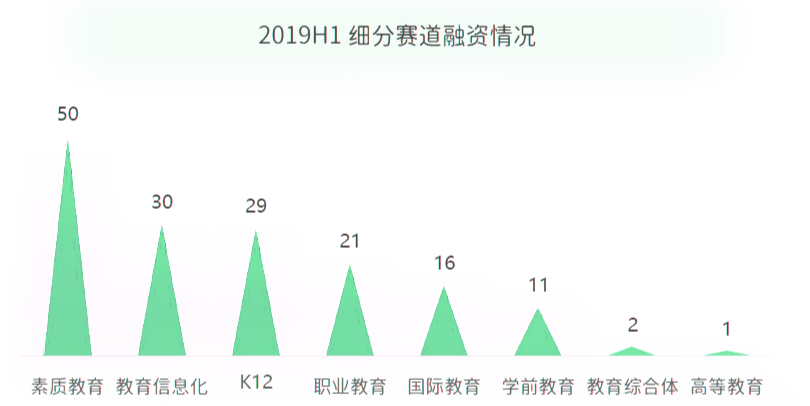 根据多鲸教育研究院统计,2019年上半年素质教育投融资事件为50起,在各赛道占第一,其中STEAM19起,生活素养及艺术培训赛道分别获得10笔及9笔。