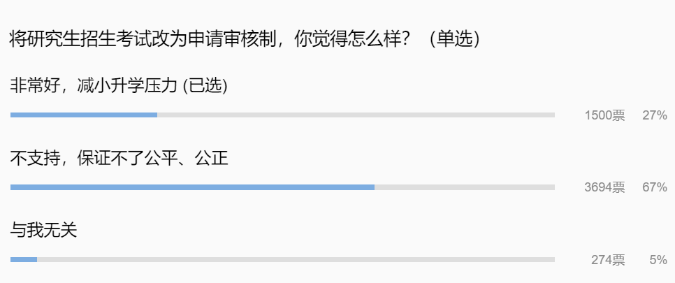 但是获得支持率最高的另一个选项则是认为改为申请审核制之后,研究生考试就变得不再那么公平了,所以大家都不希望改变现状,依然希望通过考试的形式来选拔研究生。