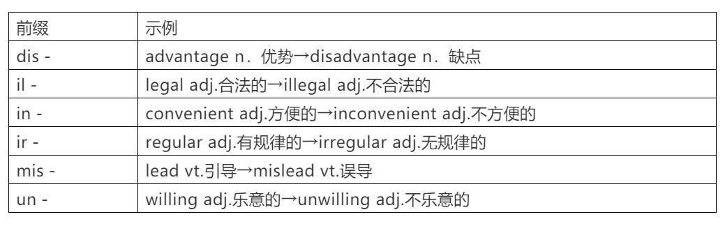 常见的表示否定或相反意义的前缀和后缀有dis-,il-,im-,in-,ir-,mis-,un-,-less等。