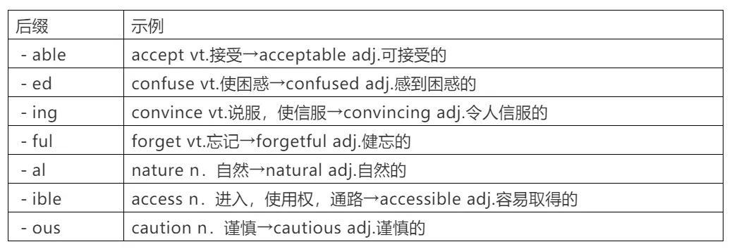 常见的动词、名词变形容词的后缀有-able,-al,-ful,-ed,-ing,-ible,-ive,-ous,-some,-y,-ern,-ish等。