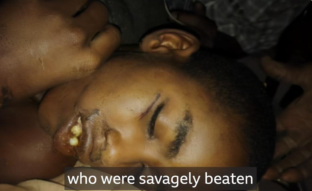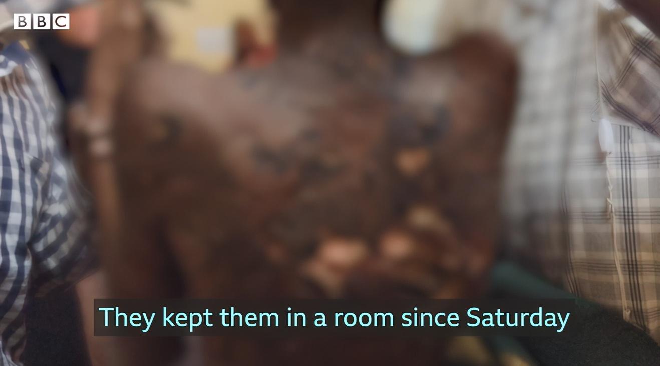 他们趴在地上,失去知觉,背部被剥去了肉。他们遭到毒打和折磨,几乎丧命。