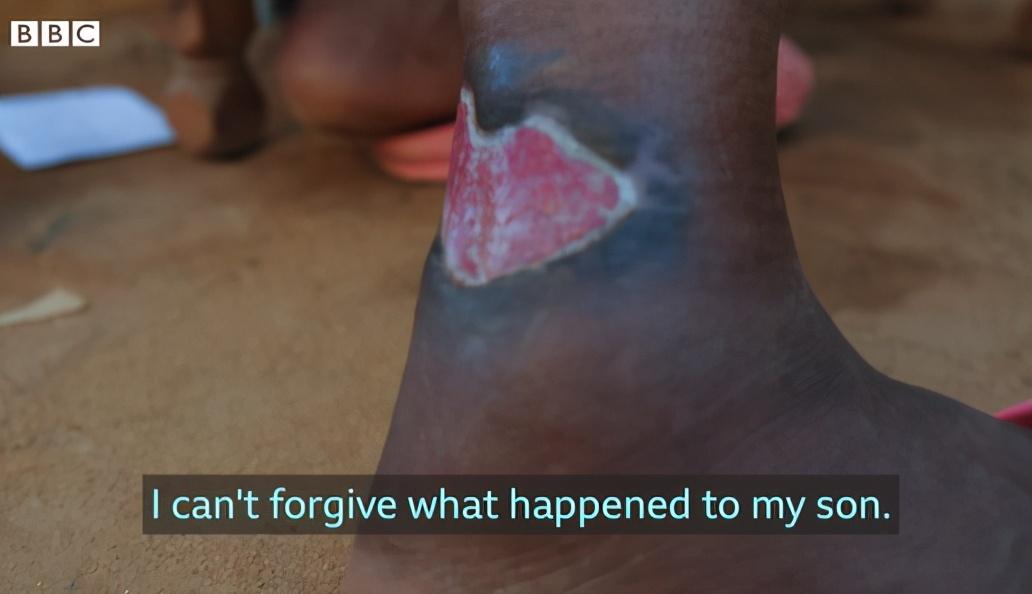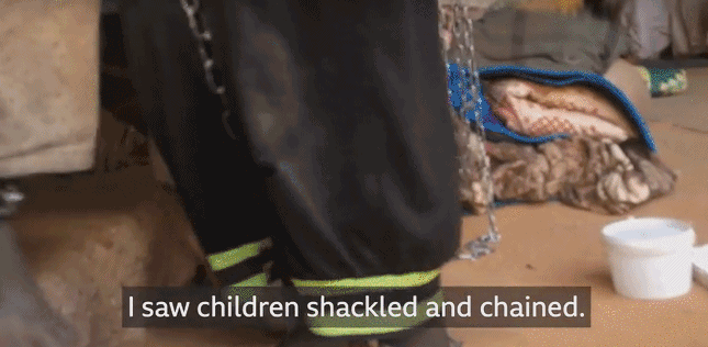 他看到孩子们有些只有五岁的小男孩,像动物一样在带上脚铐后被老师殴打,他的脚踝上有深深的已经溃烂的伤口。