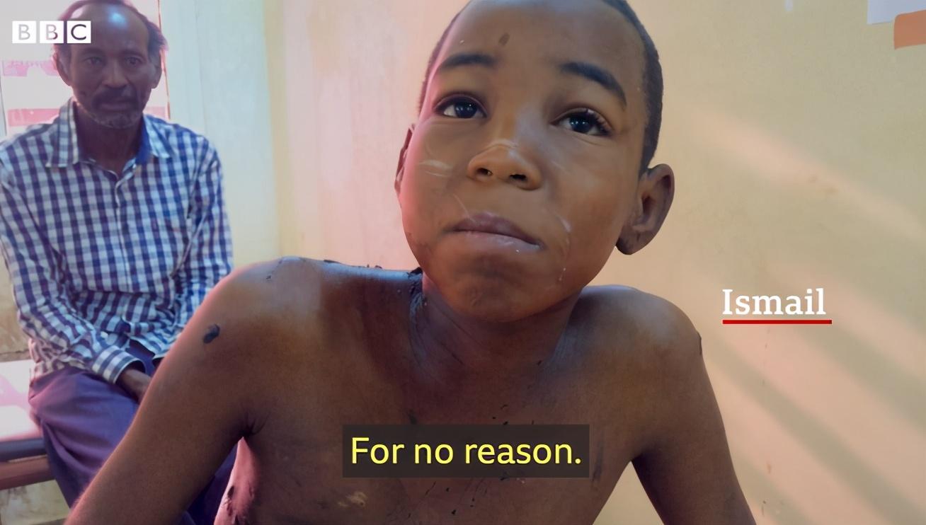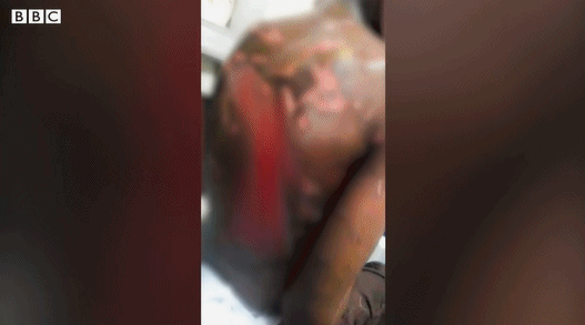 当他去医院看望他们时,他被眼前的惨状惊呆了。画面中,两名男孩的身上有大面积皮肉被剥离,脊椎骨直接从绽开的后背中露了出来。他们趴在那里,失去知觉,呼吸微弱。