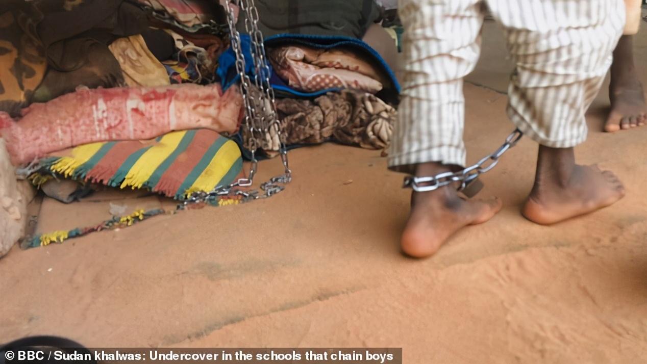 没错,很多Khalwa中,每个被家长送来上学的孩子都要带上脚铐,这所学校有50多名学生,沉重的锁链让他们很难迈开步子行走。