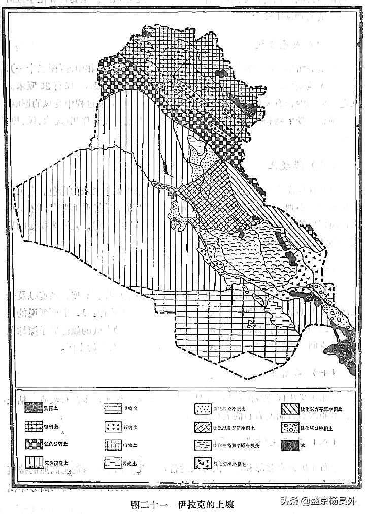 图5是《伊拉克地理》中的土壤分布图,结合我国油田探测盐碱50米深度,可知美索不达尼亚平原自古就有大量的天然盐碱地,含盐量在千分之三以下是轻度盐碱地,它的出苗率在70%-80%,重度盐碱地是指含盐量超过千分之六,出苗率低于50%,中度盐碱地介于两者之间,这是在现代农业条件下统计的数据。在古代,出苗率肯定会更低。