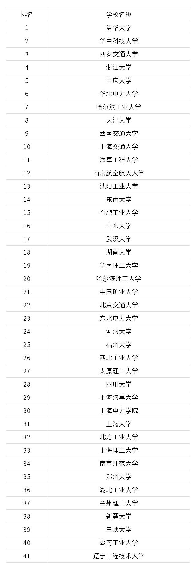 根据教育部最新第四轮电气工程学科评估结果可知:全国共有41所大学参与了电气工程及其自动化专业大学排名,其中排名第一的是清华大学,排名第二的是华中科技大学,排名第三的是西安交通大学,排名前十的大学还有浙江大学、重庆大学、华北电力大学、哈尔滨工业大学、天津大学、西南交通大学、上海交通大学。