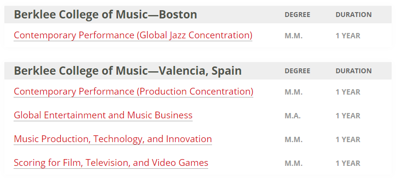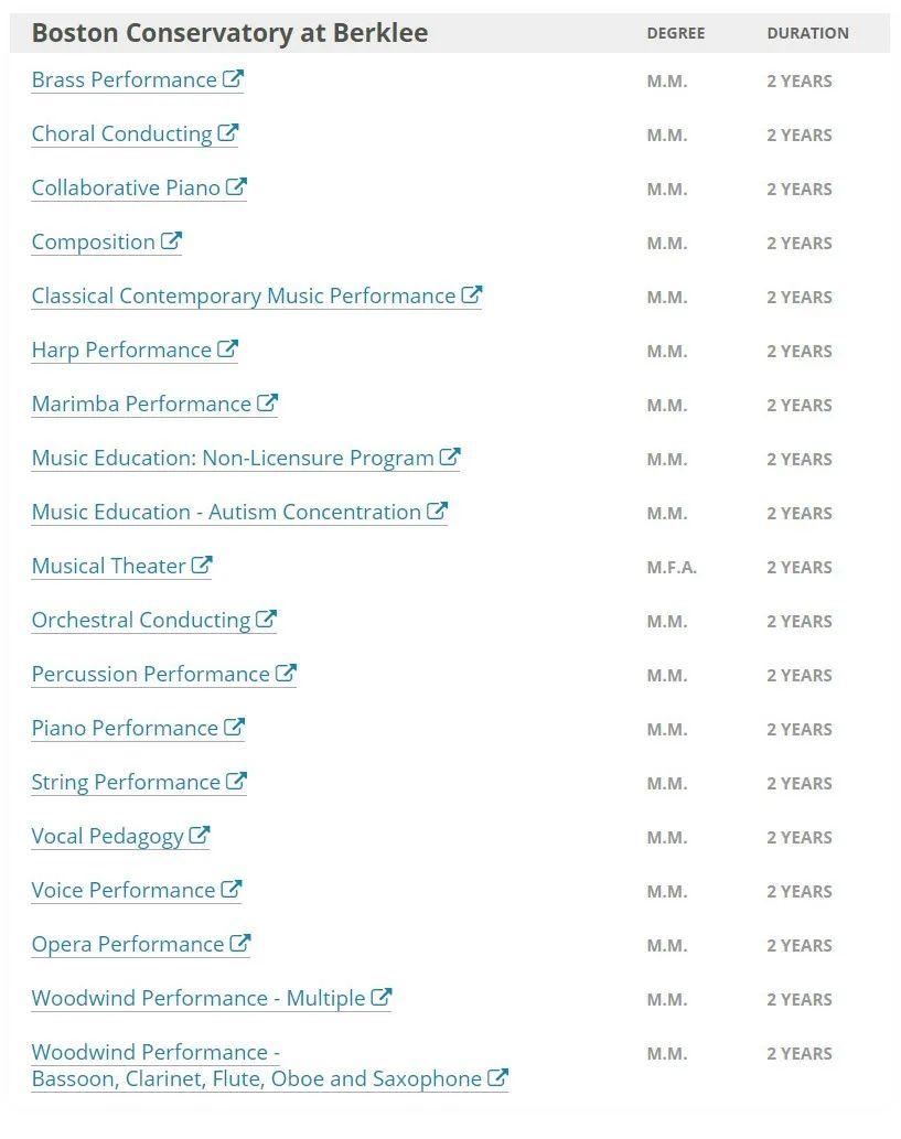 以下是伯克利音乐学院(Berklee College of Music)和波士顿伯克利音乐学院(Boston Conservatory at Berklee)对应的研究生专业、学位和学年信息。