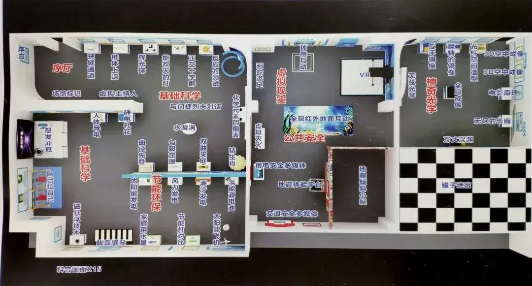 900平米占地,从序厅开始,基础科学、虚拟现实、节能环保、神奇光学、航空航天室、DIY手工室、人工智能室、创客编程室……逐次展开。