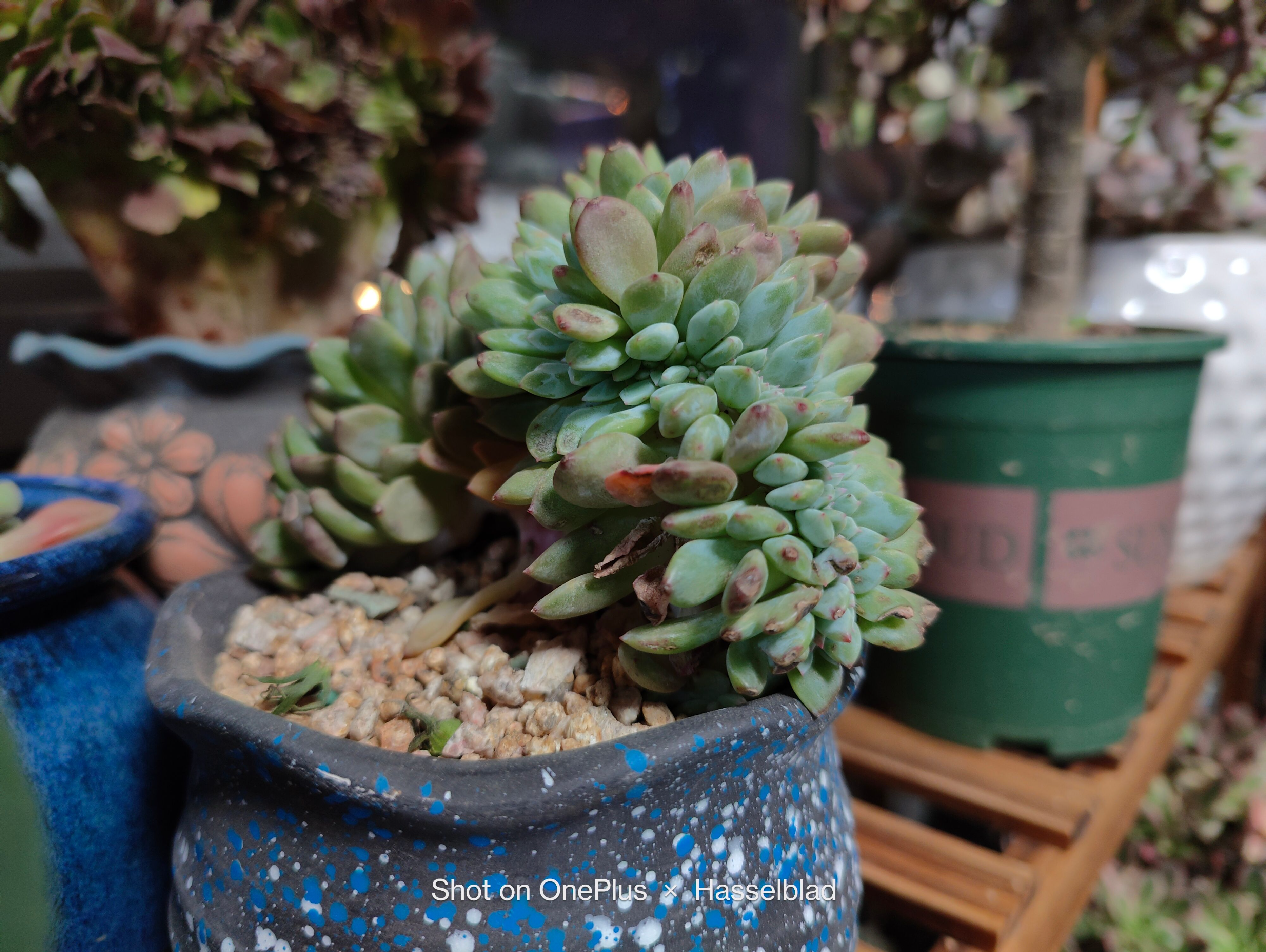 夜间节能灯下的绿植静物拍摄,曝光适当,细节丰富,没有发现明显的噪点。