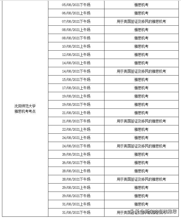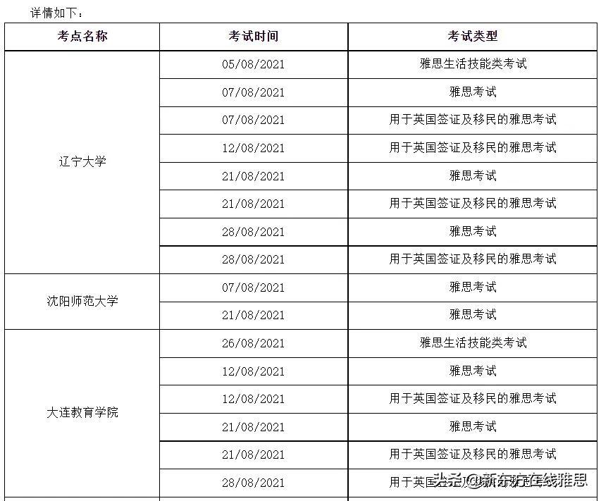 8月6日,雅思官方宣布辽宁大学、沈阳师范大学和大连教育学院雅思考点2021年8月以下场次的雅思考试、雅思机考、用于英国签证及移民的雅思考试、用于英国签证及移民的雅思机考和雅思生活技能类考试因故取消。