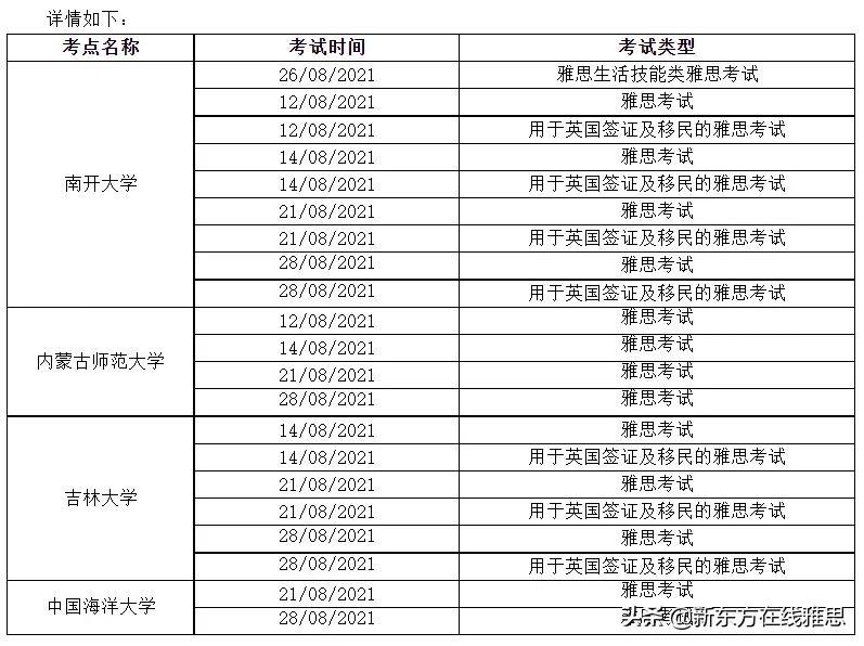 8月6日,雅思官方宣布南开大学、内蒙师范大学、吉林大学和中国海洋大学雅思考点2021年8月以下场次的雅思考试、用于英国签证及移民的雅思考试和雅思生活技能类考试因故取消。