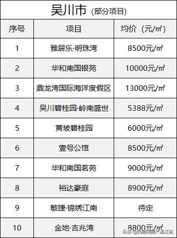 据不完全统计,吴川楼市在湛江有21个项目在售,截止3月新房均价约6600元/㎡。