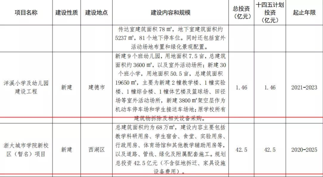 2021年6月,杭州市发展和改革委员会发布了《关于公开征求〈杭州市社会发展“十四五”规划(征求意见稿)〉意见建议的公告》,根据杭州市社会发展“十四五”规划重点项目表显示,浙大城市学院新校区(暂名)项目总建筑面积约为68万㎡,规划总投资42.5亿元。