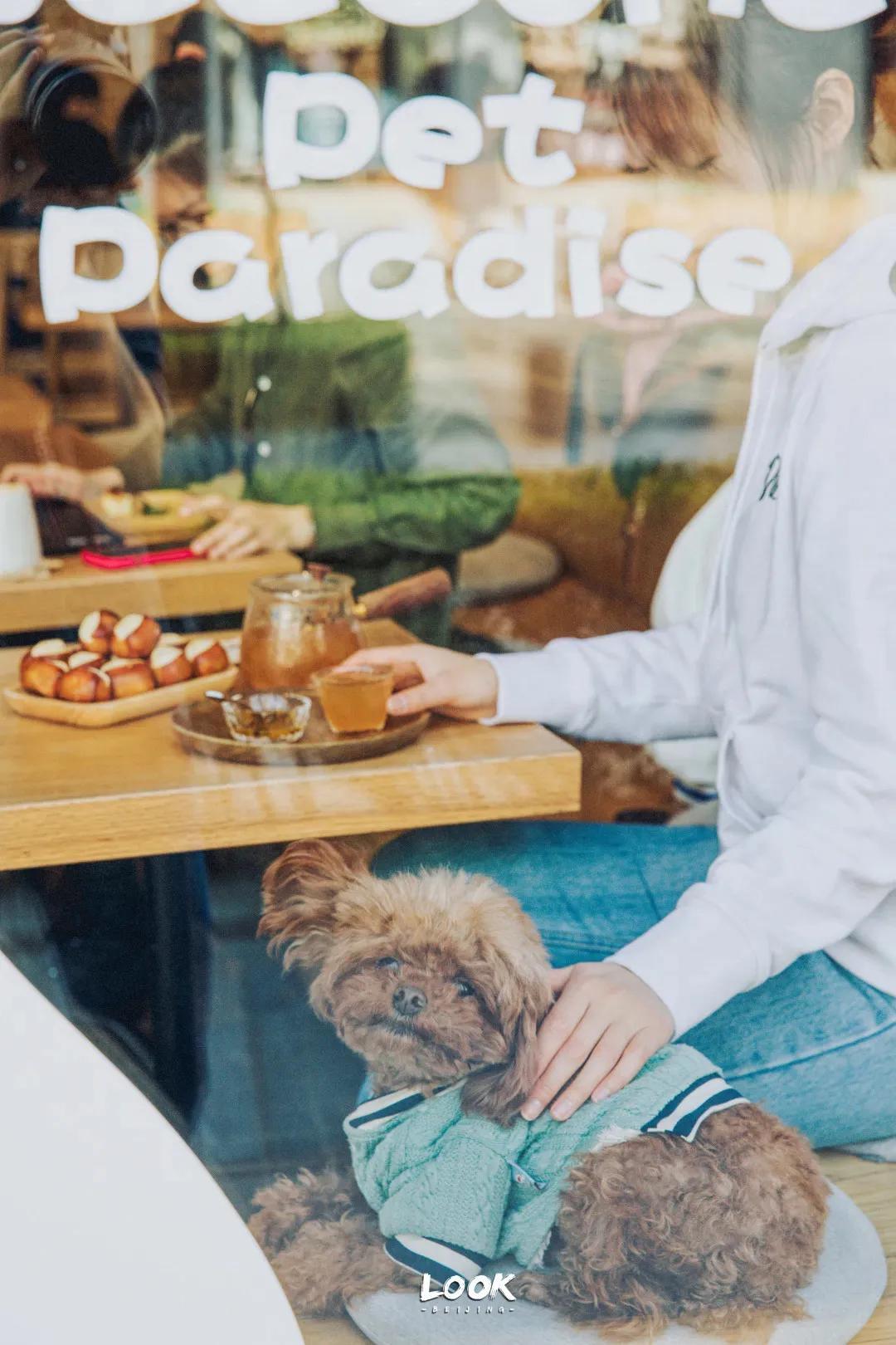 三里屯高人气面包店、门口的玻璃上印着狗狗剪映的"welcome pet paradise",是众所周知的宠物友好店铺。