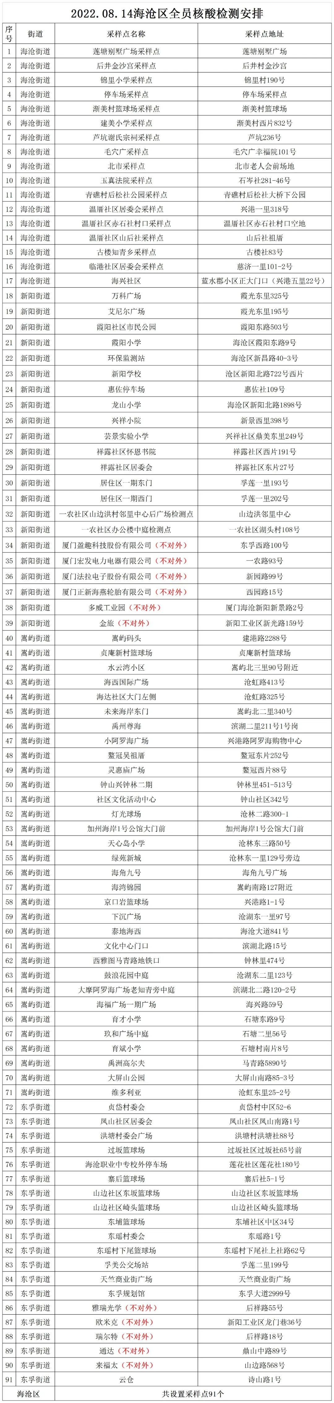 根据厦门市疫情防控工作指挥部〔2022〕19号通告要求,决定于8月14日在海沧区开展一轮全员核酸检测。现将有关事项通告如下: