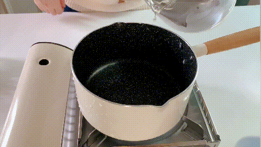 奶锅中加入100ml清水,再加入35g冰糖,开小火煮至冰糖完全融化。