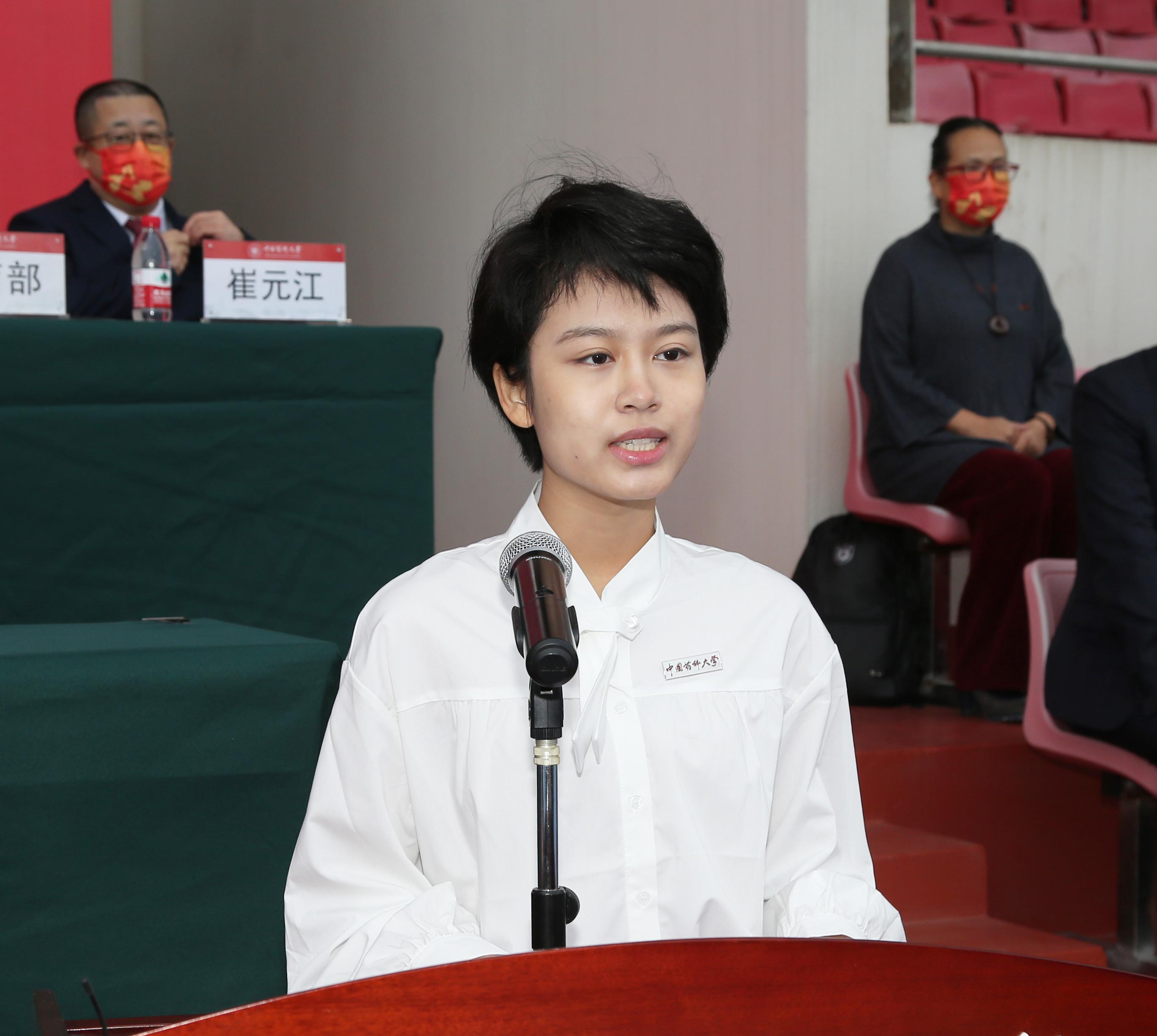 在发言中,陈鑫宇以药大青年志愿者的视角,生动诠释了疫情防控里的“中国速度”和“中国情怀”,她还引用了药大党委书记金能明“新生第一课”上的励志话语“身为药大人,我们应当认真体味药学工作者的‘志气’,‘骨气’和‘底气’,破冰前行,勤奋学习,为药学事业的发展添砖加瓦”,与全校新生共勉。
