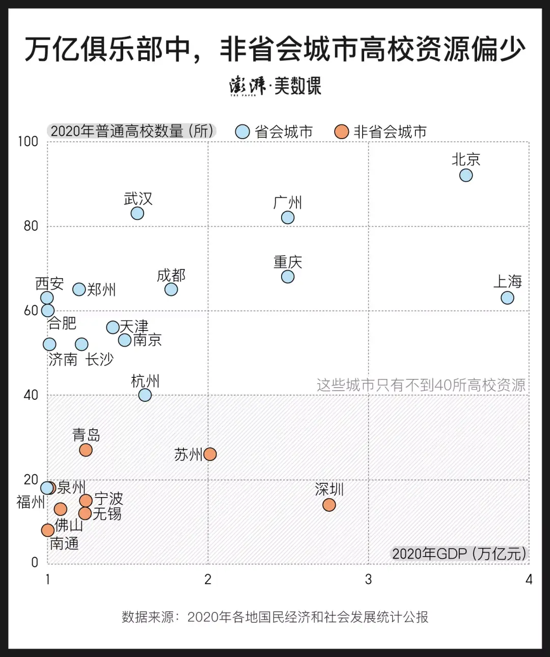 上图可以看出省会城市和非省会城市的差距,最强地级市高校不足30所,鹏城更是不想说话。这种上世纪50年代的布局,对新兴城市的发展不太友好,高等教育作为科技和人才的重要结合点,如果一座城市一直缺失,那么经济也很难长期保持优势。