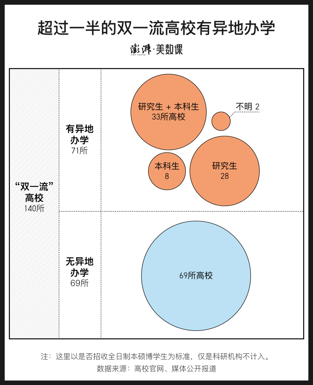 根据澎湃新闻梳理的140所“双一流”建设高校的异地办学情况,全国共有71所“双一流”建设高校在异地开设了校区或研究生院(包括已签约项目),设立机构数达到108个。