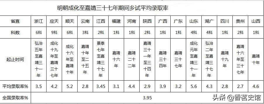 明清乡试录取的人数,通常由朝廷按照各省人口和文教情况分配,通常从数十名到一百多名不等,每次乡试全国录取总额约为一千人至一千二三百人。按照统计,明朝成化至嘉靖年间,全国乡试录取率维持在4%上下,而隆庆以后的录取率在3.1%左右,就录取率而言,举人可以说是科举中最难的一关,因而也有“金举人、银进士”之说。