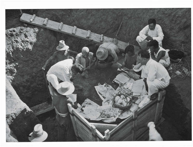 1936年6月,YH127坑被发现,考古队决定整体打包运回南京。图为最后钉箱盖前整理内部情形