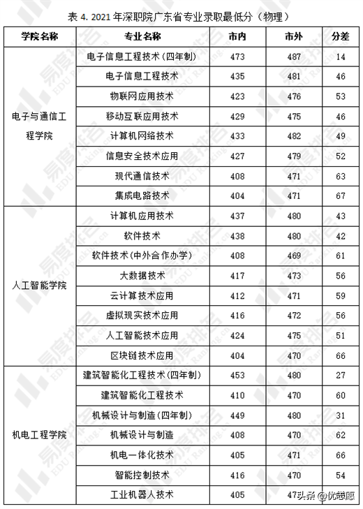 表4和表5分别展示了2021年深职院在广东省物理组和历史组的专业录取最低分(分深圳市内和深圳市外)。电子信息工程技术(四年制)是物理组中录取最低分最高的专业,动漫制作技术是历史组中录取最低分最高的专业。可以看出深职院市内市外同专业的录取最低分存在一定差异,部分专业的录取分差甚至超过70分。尽管市内考生在报考深职院时享有一定优惠,但是市内考生的高考成绩仍要高于本科线才有机会被深职院的电子信息工程技术等优势专业录取