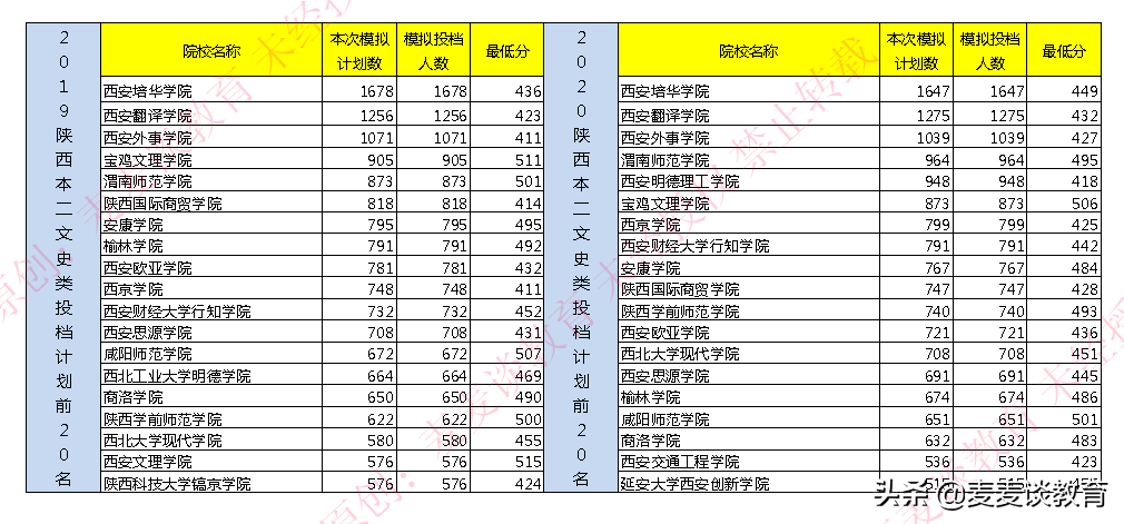 从该表中,我们看出,较2019年的录取数据,录取计划人数最多的前三名学校还是这三所:西安培华学院,西安翻译学院,西安外事学院。较去年相比,录取人数分别减少了31人,增加了19人,减少了32人。录取最低分在1-5分变化范围以内。
