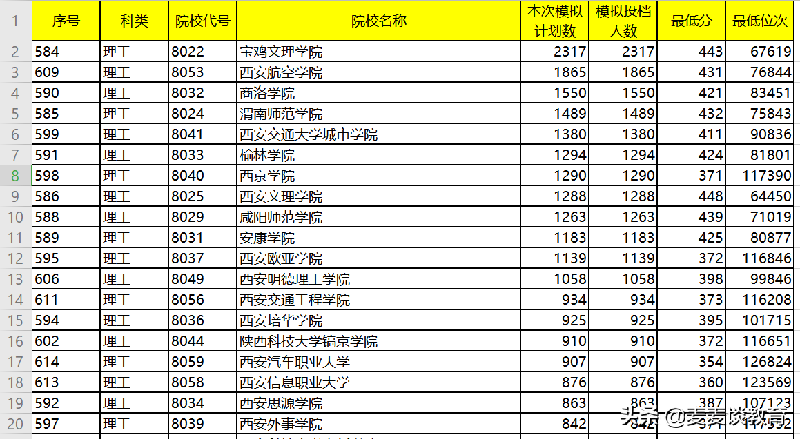 从表中,我们看到,招收人数前二名的院校还是宝鸡文理学院和西安航空学院。较2019年相比,分别减少了45人和增加了40人计划。而西安明德理工学院是今年在陕西新增的一所院校,去年没有这所大学,今年计划招生1058人。宝鸡文理学院录取最低分443较去年的460减少了17分, 西安航空学院录取最低分431较去年的452减少了21分。