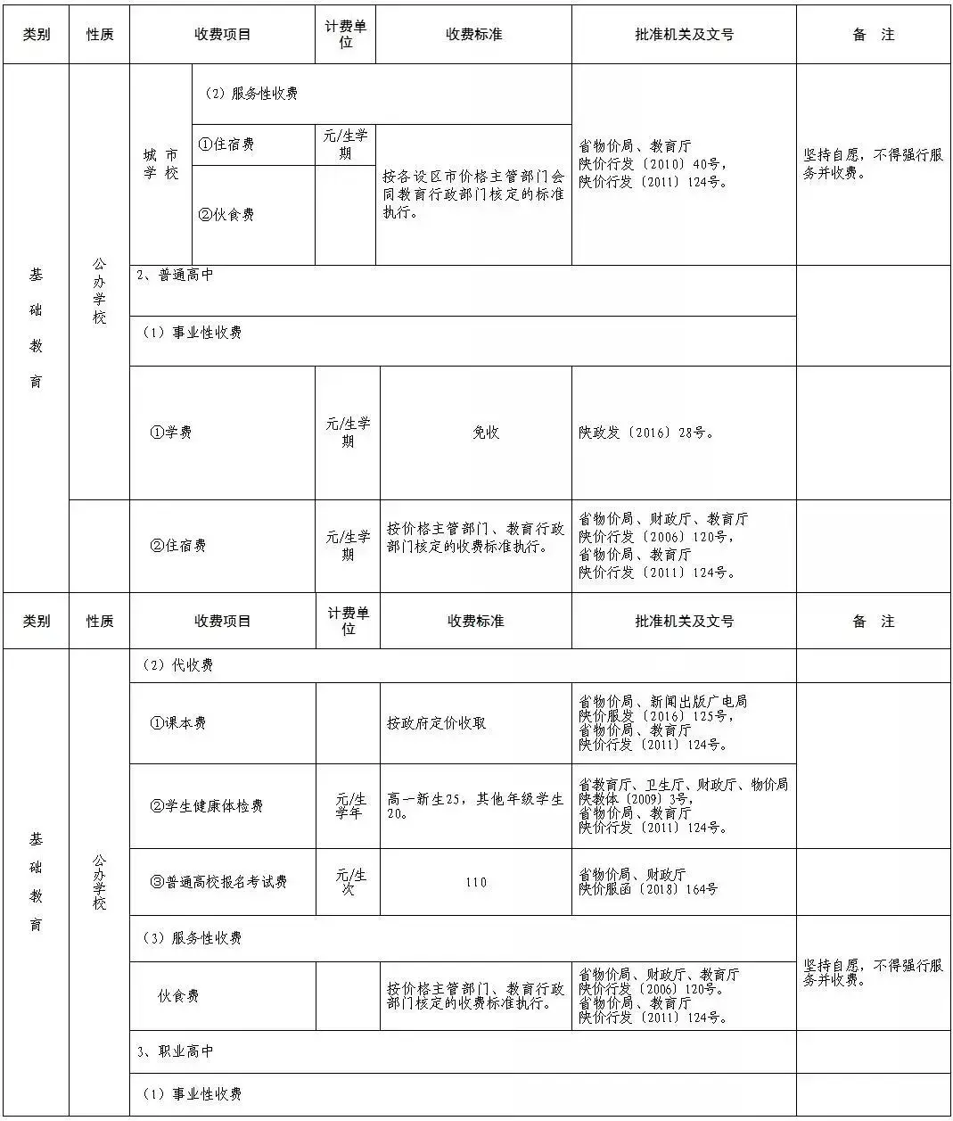 为切实加强教育收费管理,进一步规范学校收费行为,日前,陕西省发展和改革委员会、省财政厅、省教育厅、省市场监督管理局联合印发《关于陕西省2019年秋季中小学校及普通高校收费的通告》(陕发改价格〔2019〕926号),公布了陕西省今年秋季中小学及普通高校收费标准。