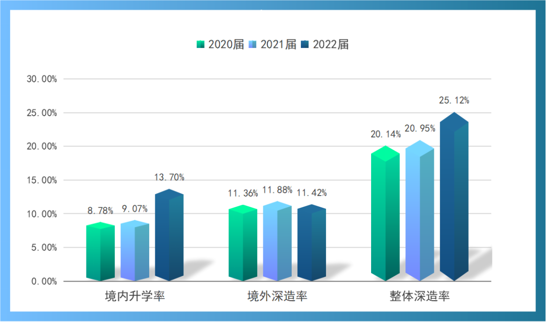 本科生毕业后继续深造,继续积累知识、积蓄能量,适应性会更强、竞争性会更大,未来的发展空间就会更广阔。近年来,继续深造成为众多学子的重要选择。2022年,浙大城市学院2022届毕业生整体深造率达25.12%,比2021届提高4.17%,再创新高。