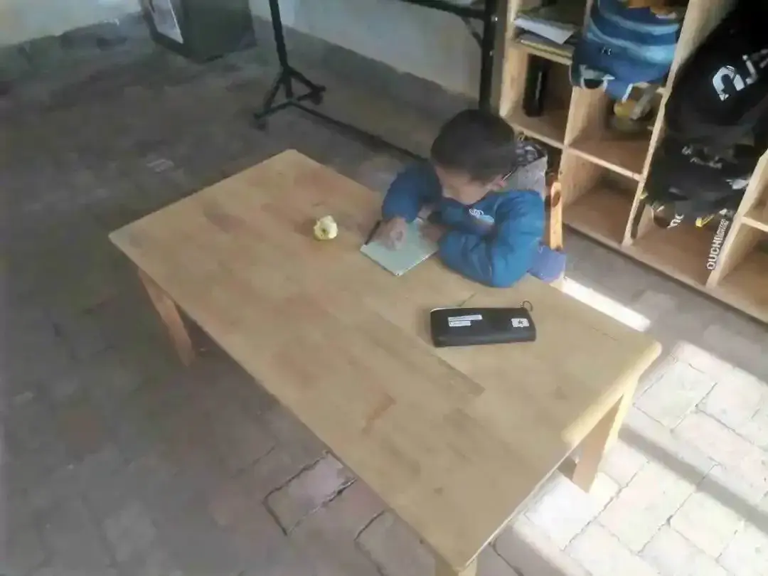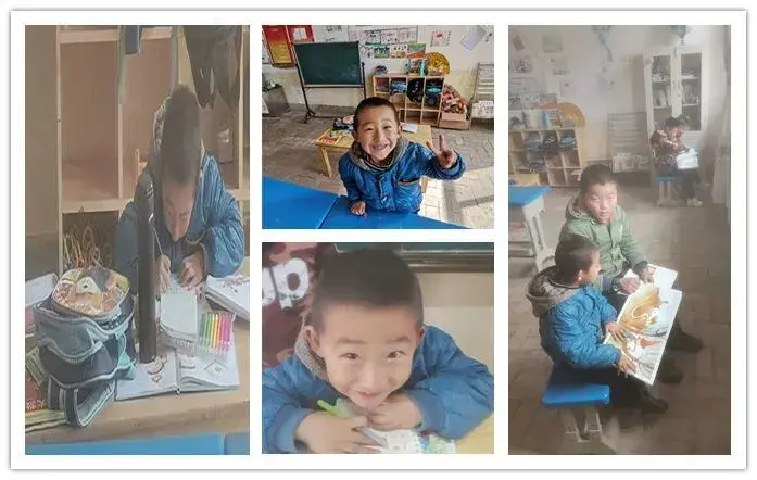 这个笑起来天真烂漫的孩子,是幼儿班唯一的学生。出于安全考虑,韩老师就把他的课桌搬到了五年级。大洲老师特别喜欢给他拍照片,他一直觉得这个孩子的眼睛里面有光,他的眼里满满都是对外面世界的好奇和渴望。在这个调皮捣蛋的年纪,他却异常懂事和听话。上课认真学习写字,喜欢画画,喜欢听故事......课间经常让高年级的大哥哥给他讲故事,无论什么故事,他总是听得津津有味。