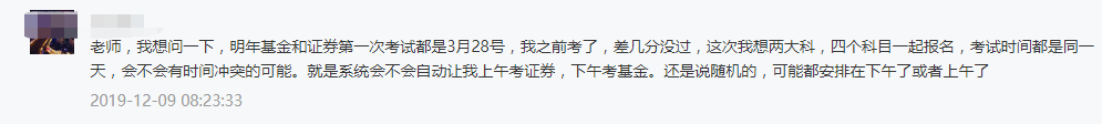 证券和基金从业按理是可以同时报考的,但是2020年3月证券、基金考试在同一天进行,基金从业在3月28日一天,证券从业在3月28日、29日两天。很多同学可能想说,会不会给我分配到不同时间考试呢?