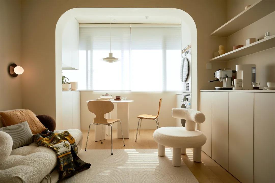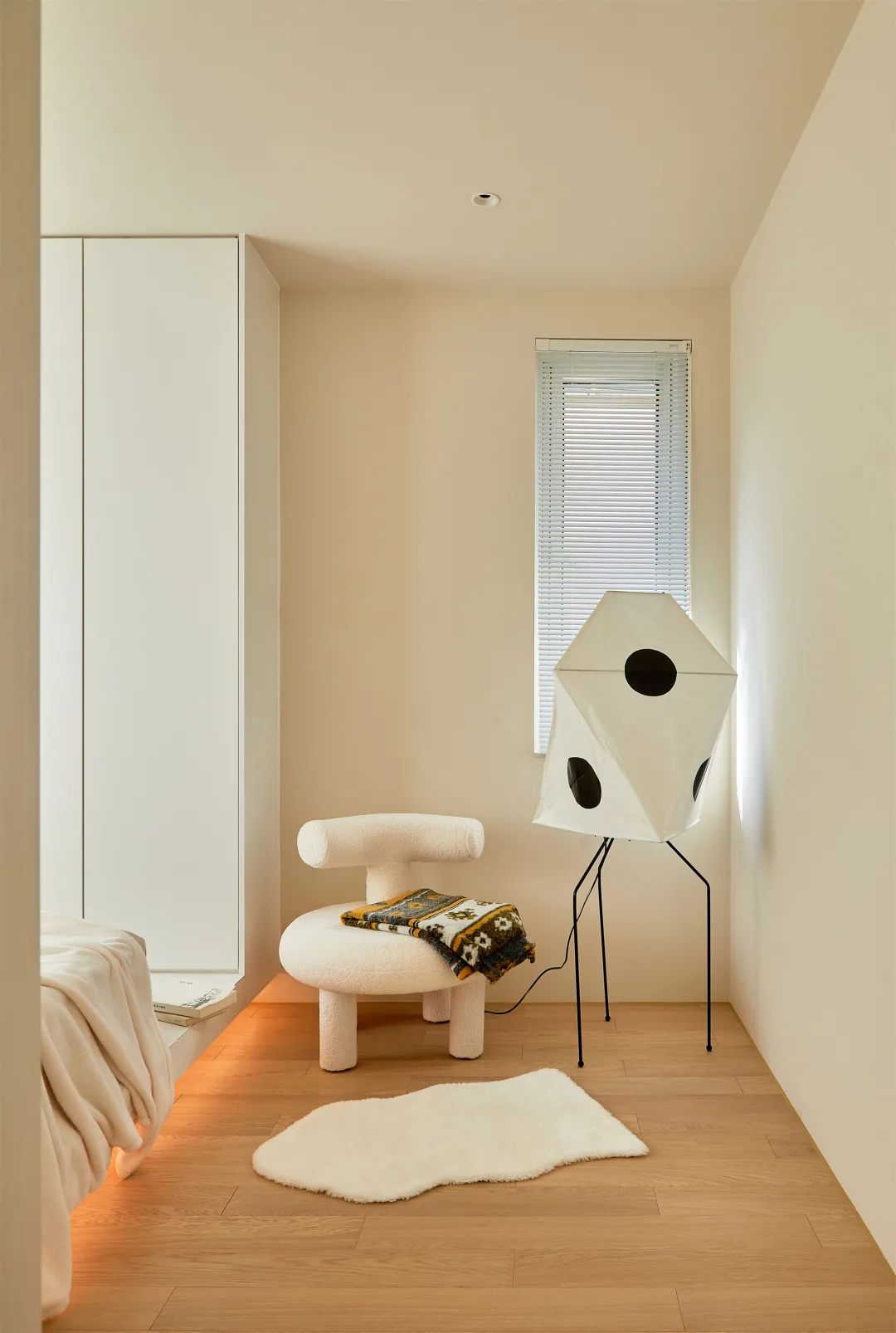①整屋装修选择极简风,墙面、天花板、柜子均采用奶油白色,搭配浅木色的地板,营造清爽温馨的居住氛围。
