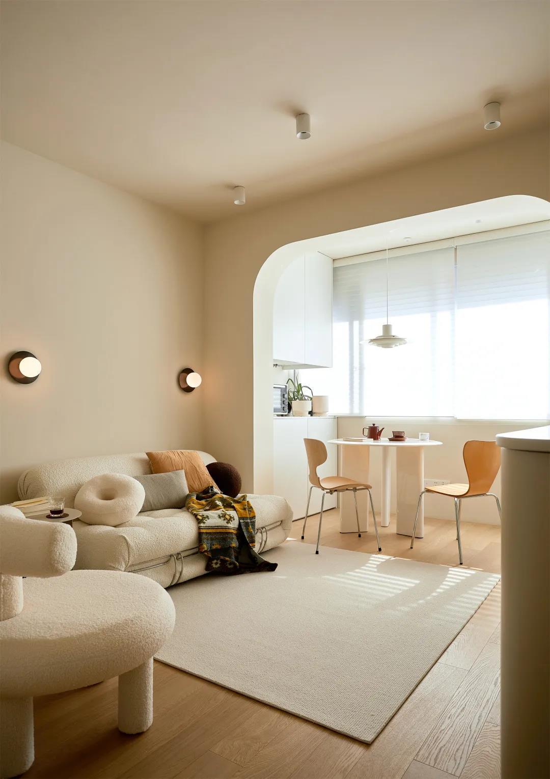 由于房子的面积有限,入户并没有传统的玄关,设计师在入户门的左侧,沿着墙面定制了顶天立地的大鞋柜。为了降低柜体带来的突兀感,设计师特意在柜子的两侧边缘,增加了圆角弧线的处理,再加上和墙面相同的奶油白配色,视觉感更加协调统一。