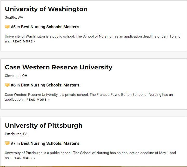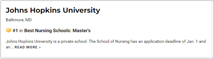 想要成为高级执业护士,学历背景非常重要,大多数医院对于高级执业护士的要求是拥有硕士及以上学位。本次US News排名中,约翰·霍普金斯大学获得冠军,杜克大学获得第二名,埃默里大学获得第三名。以下为本次排名前10的大学:
