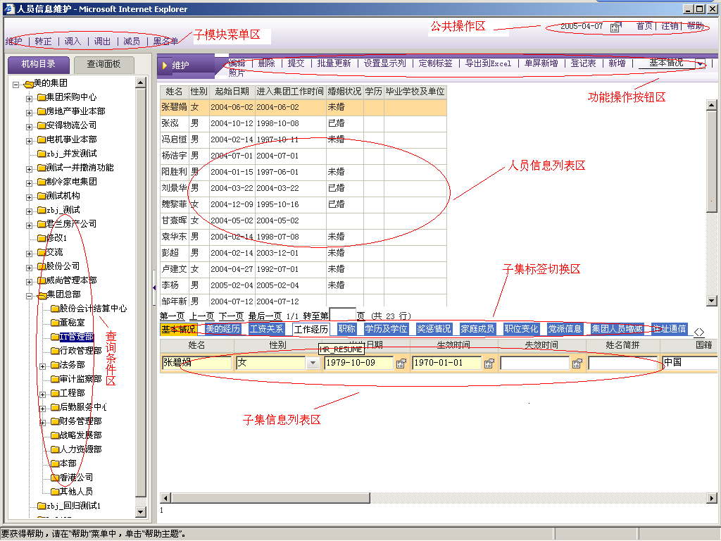 员工信息的录入和随转正定级的更新由于特殊需要造成的职位增加、减少或职位要求、职责的变更这两方面操作的操作者均为员工所在最小单位的人力资源管理部门的职位管理人员。如,美的日电微波炉事业部的新员工,信息由微波炉事业部的人力资源部门职位管理人员录入。