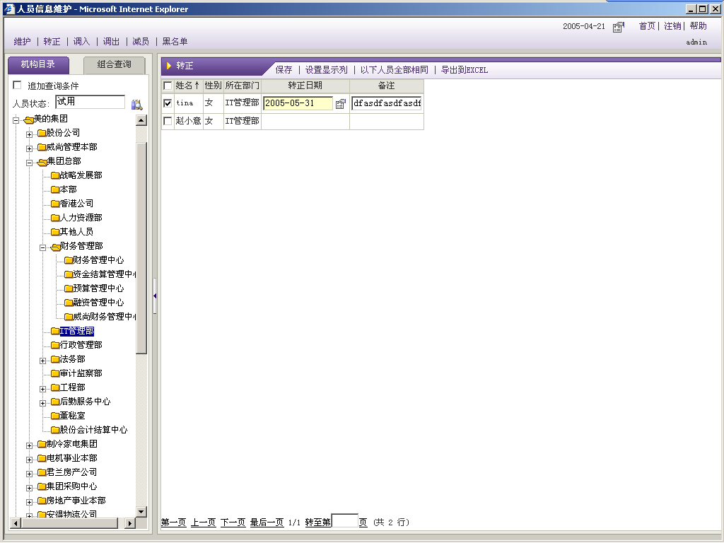 完成上面操作后,还需要在“美的人力资源管理信息系统”中对变更的人员进行进行任职操作,使新到岗的员工能够担任新的职位。任职的具体操作请参考《美的人力资源管理信息系统用户使用手册》的“3.11.1 任职”。