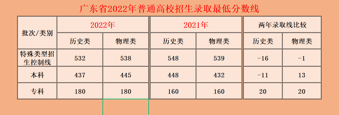 2022年广东省特殊类型招生控制线(历史类)为532分,比2021年降低了16分;特殊类型招生控制线(物理类)为538分,比2021年降低了1分。