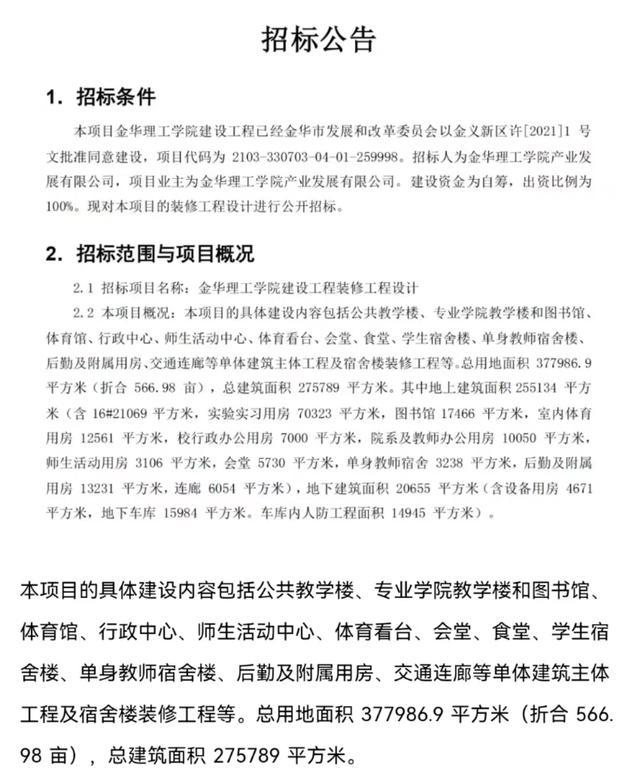 目前,该校也在正在进行积极的筹备工作,投入到学校的相关建设工程当中。金华高等研究院是金华理工学院的筹建母体,也是市政府直属全额拨款事业单位。近日,相关部门发布了学校的建设工程概况和招标条件,这也标志着学校落地也是指日可待。