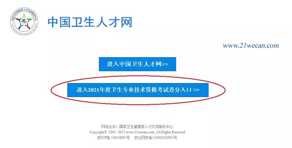 1、 登陆“中国卫生人才网”网站,点击“进入2021年度卫生专业技术资格考试查分入口”。