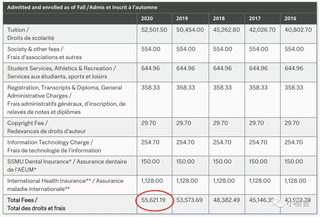 2019年入学的国际留学生,2019-2020学年的学费是58,680加币,2020-2021学年的学费已经突破6万加币,变为60,440加币,2021-2022学年学费直接涨到了62,250加币。国际留学生的学费每年都在涨,年涨幅大约3%。