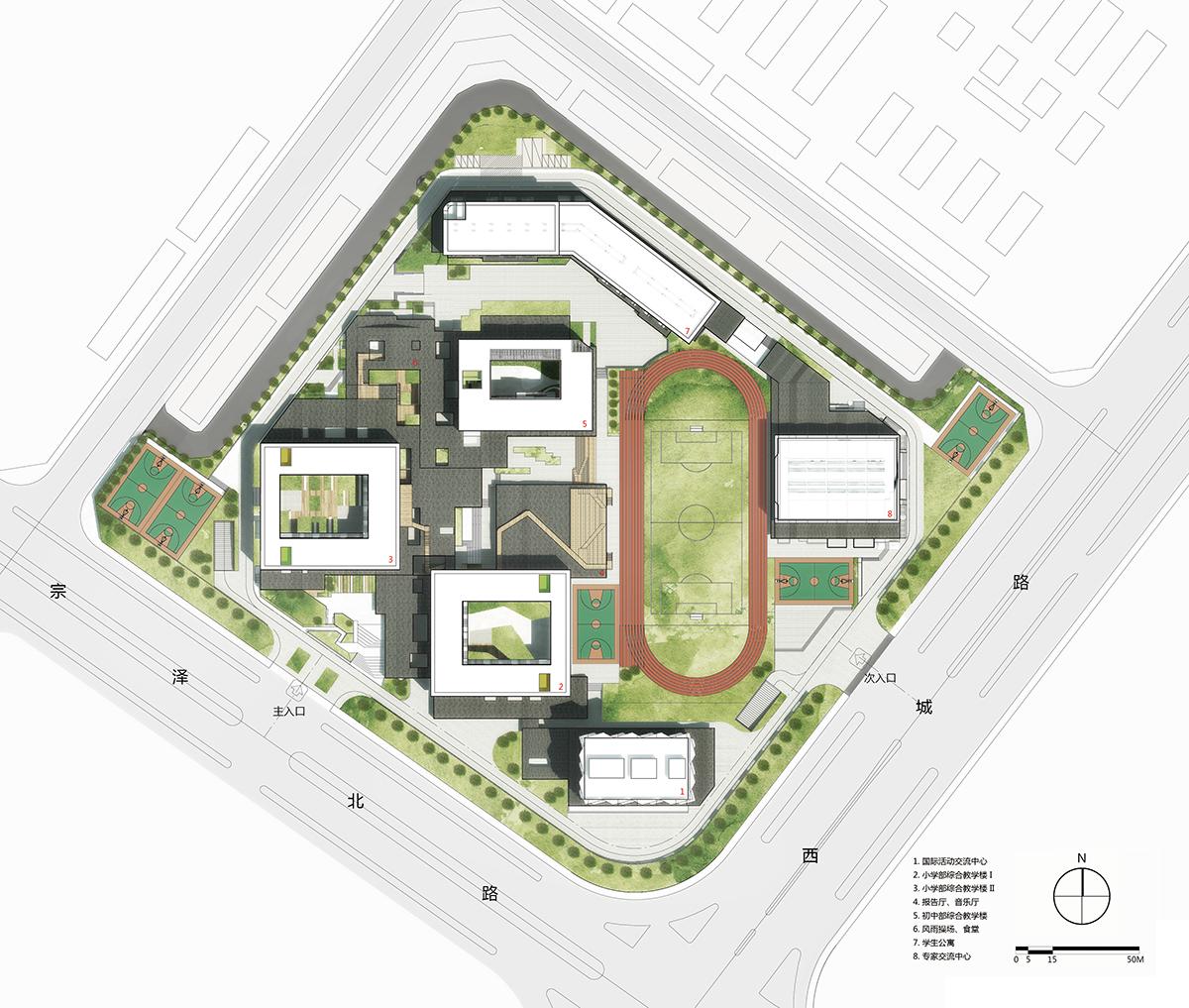 所以本项目具有相当的挑战性——建筑规划如何定义教育类空间在城市高密度环境中的微妙立场,以及巧妙解决用地条件不足下的教学空间布局问题;建筑形态如何诠释义乌既以国际贸易为支柱产业又以传统浙派建筑为建构文化脉络的当代建筑特征;建筑空间如何应对新世纪外国语学校将国际化教学体系与传统国学文化兼容并重所需的教学空间要求。这些挑战是飞速城市化进程中的中国所普遍面临的问题,也是零壹城市一直以来持续关注的高密度城市与教育问题的聚焦点。