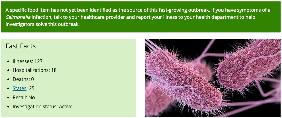 CDC在9月17日就发布了近期沙门菌感染案例猛增的警告。CDC的数据显示,从8月初至今,全美经报告的沙门菌感染病例有126人,其中病例爆发的高峰期在8月20日前后,随后该数字一路降低。
