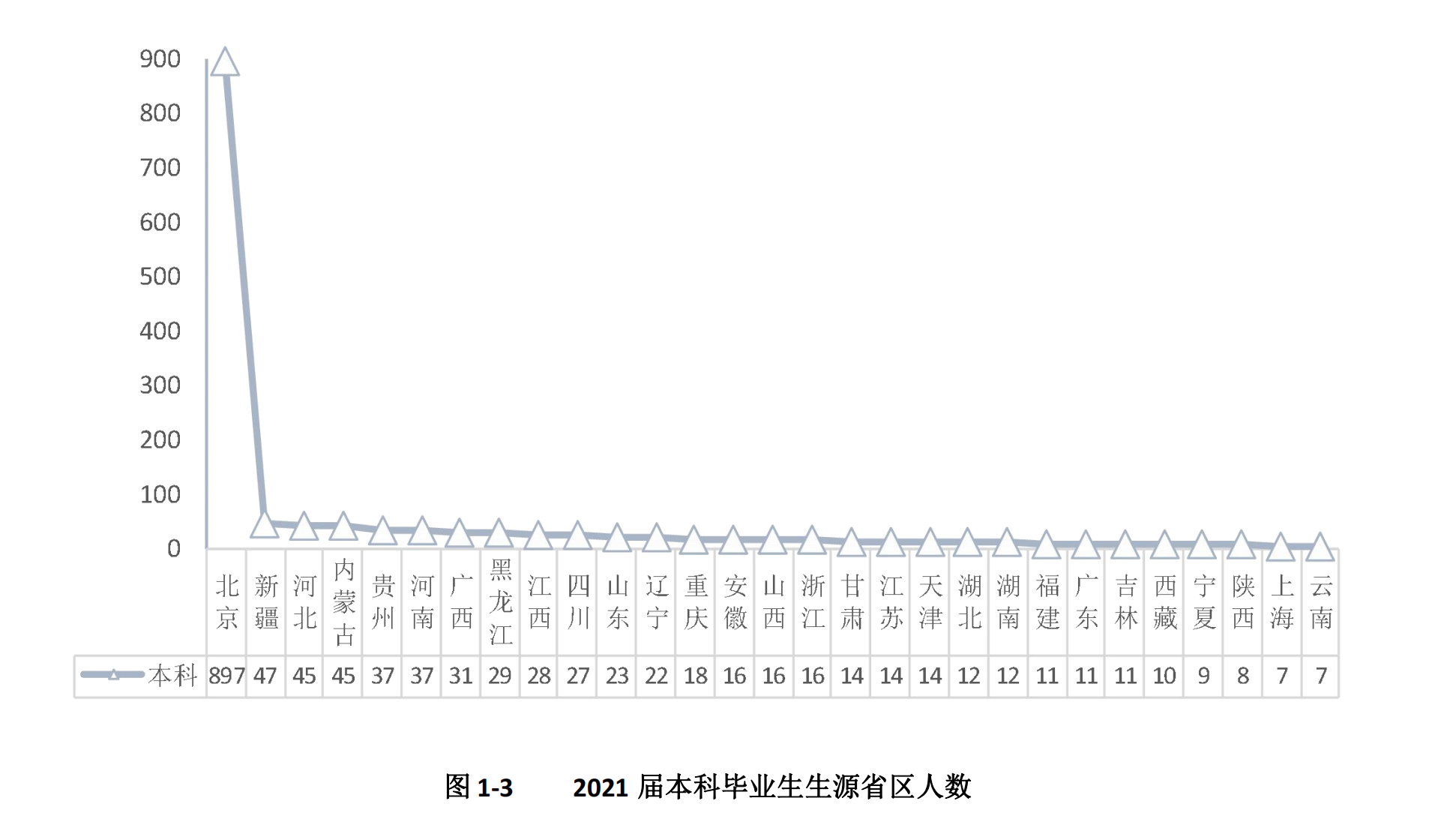 根据报告,北京物资学院2021 届毕业生人数共有 1804 人,其中,本科生 1474 人;本科毕业生中,男生 578 人,占 39.21%,女生 896 人,占 60.79%。毕业生生源来自全国 29 个省、市、自治区,其中主要为北京生源 897 人,占 60.85%,其次,分布在新疆 47 人(3.19%)、河北 45 人(3.05%)、内蒙古 45 人(3.05%)。