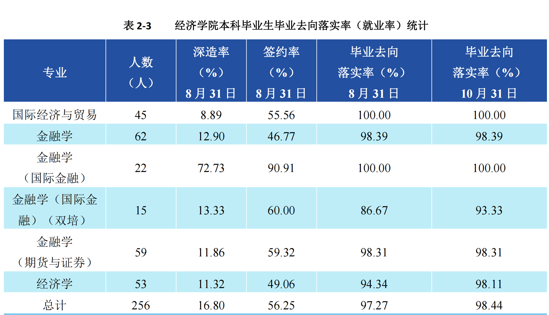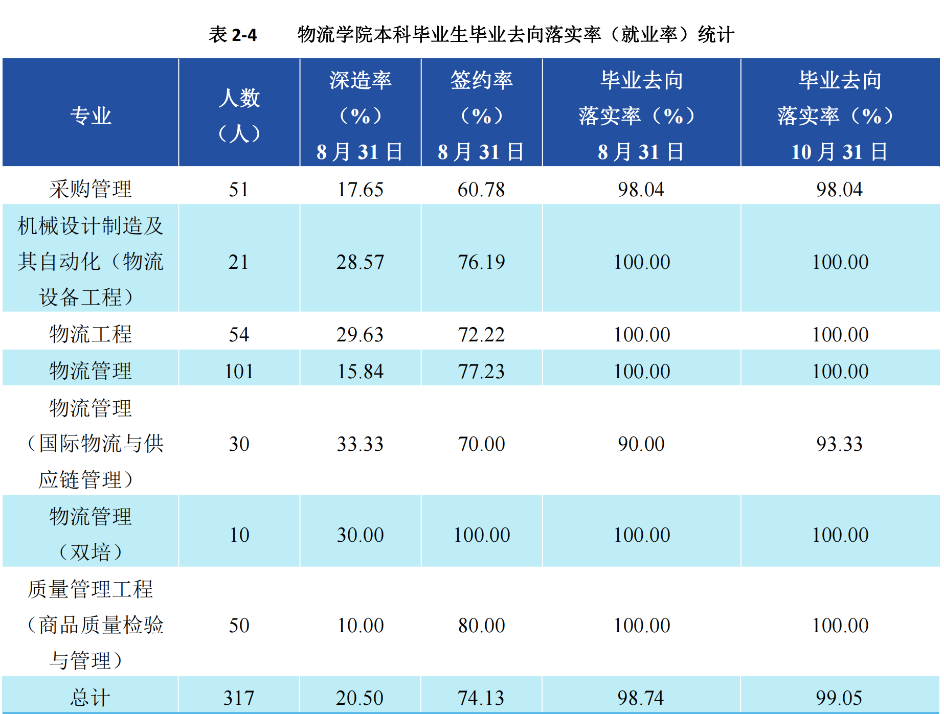 截至 2021 年 8 月 31 日,北京物资学院2021 届本科毕业生的毕业去向落实率(就 业率)为 95.05%。从专业分析,国际经济与贸易、金融学(国际金融)、物流工程、物流管理、质量管理工 程(商品质量检验与管理)、机械设计制造及其自动化(物流设备工程)、物流管理(双 培)、电子商务(互联网物流)(双培)的毕业生落实就业的比例为 100.00%,金融学等 17 个 专业的毕业去向落实率(就业率)在 90.00%及以上。分学院和专业的详细情况,可以看下面6张图片。