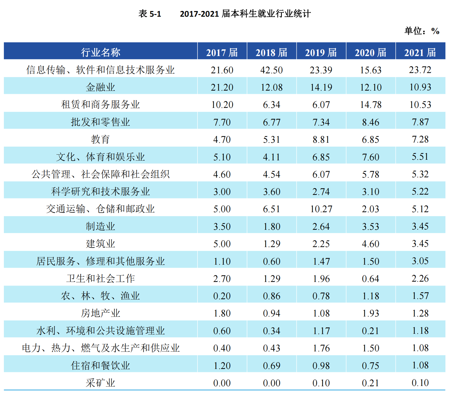 根据五年统计,北京物资学院2017-2021 届本科生就业行业,一直集中于信息传输/软件和信息技术服务业、金融业、租赁和商务服务业、批发和零 售业。